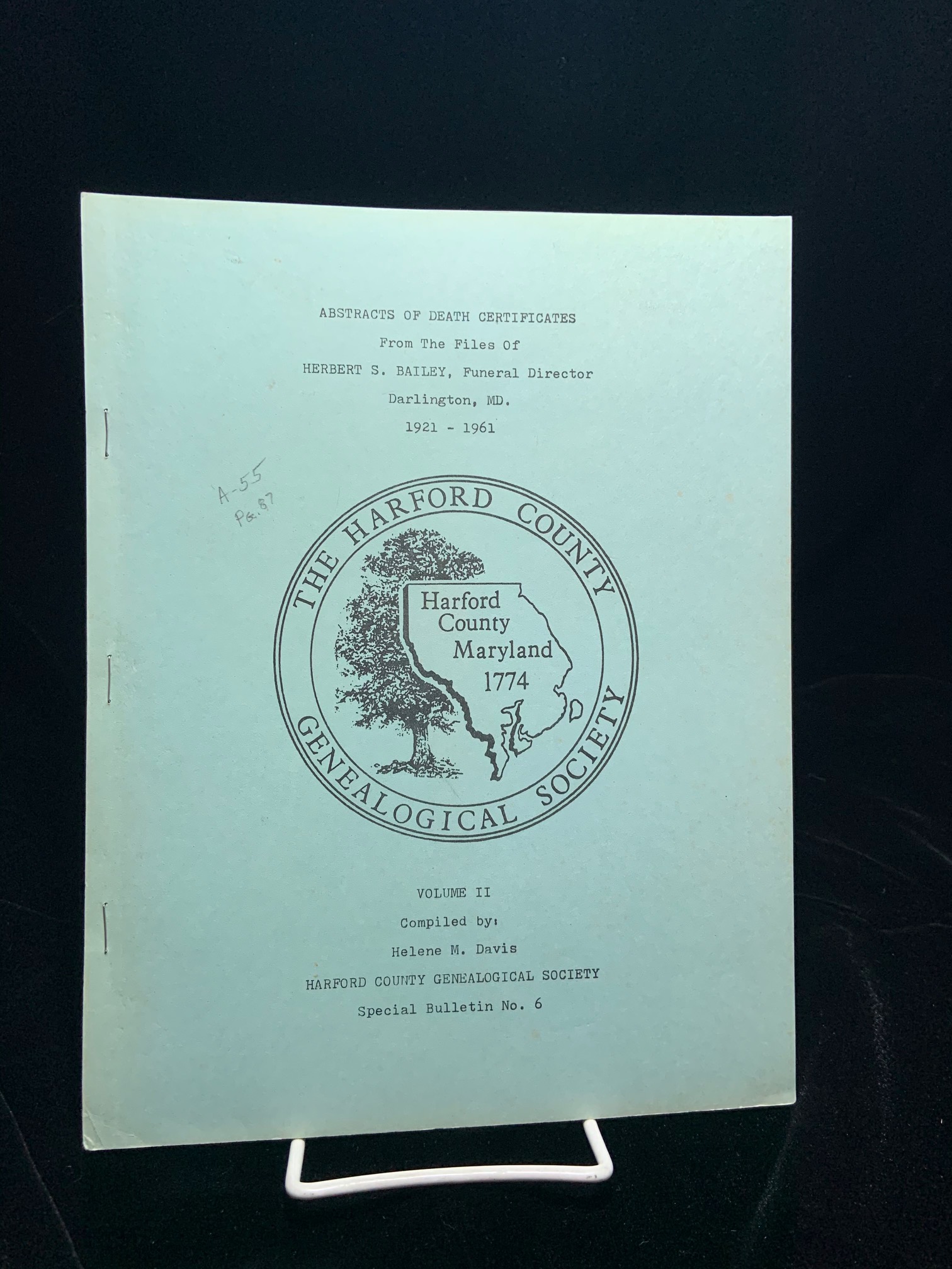 Abstracts of Death Certificates From the Files of Herbert S. Bailey, Funeral Director, Darlington, MD, 1921-1961 Volume II. Compiled by Helene M. Davis. Harford County Genealogical Society. Special Bulletin 6. Digital