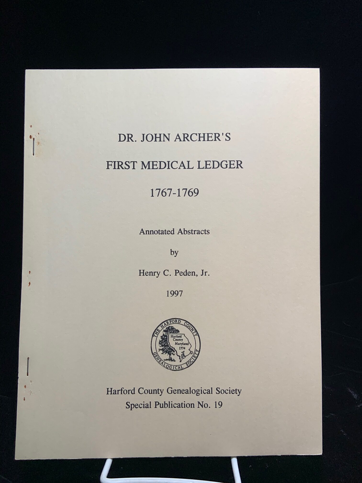 Dr. John Archer’s First Medical Ledger, 1767-1769, Annotated Abstracts by Henry C. Peden Jr. Special Publication 19 of The Harford County Genealogical Society. Due to limited inventory photocopies may be provided.